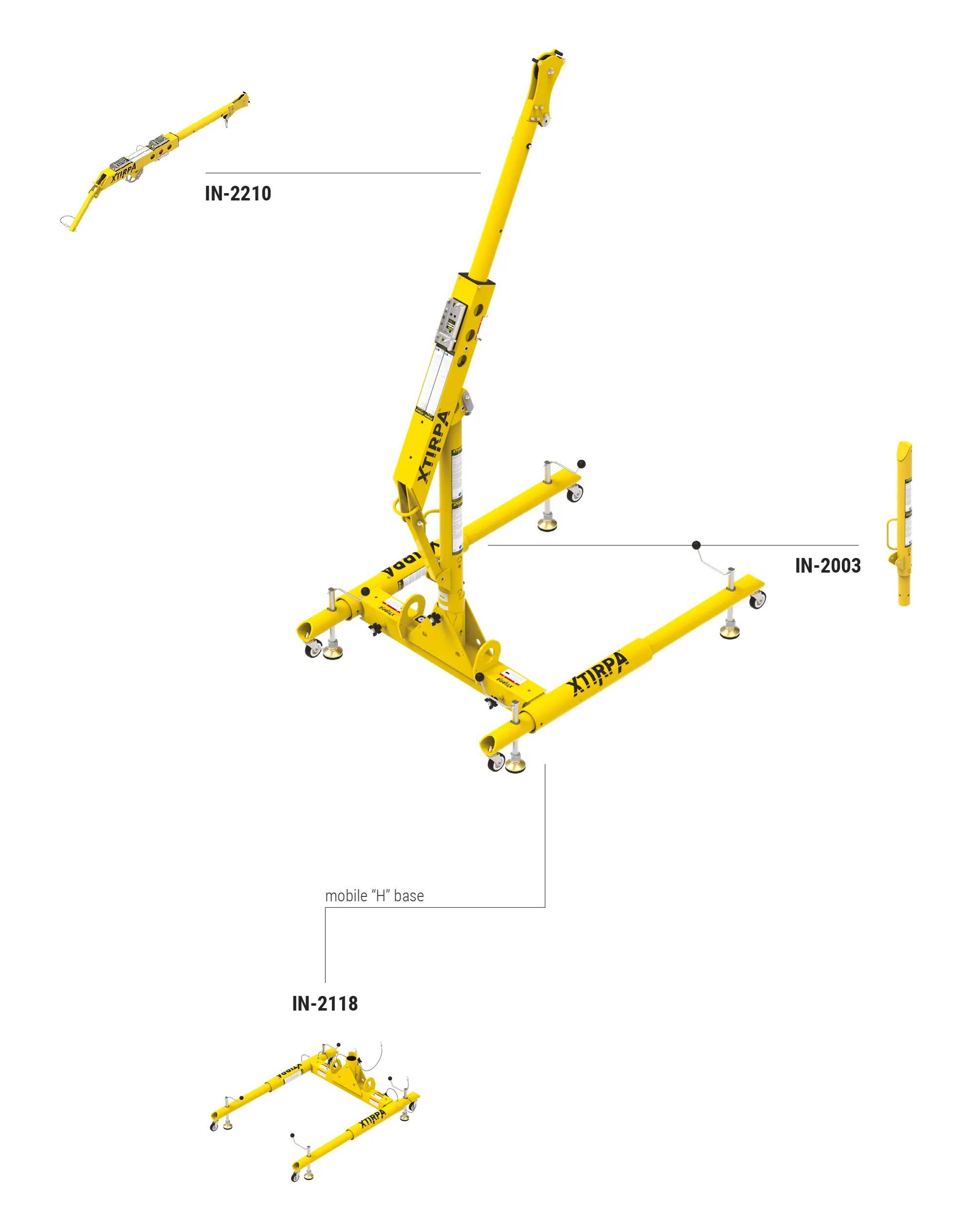Het IN-8004 systeem, ook bekend als de “H-Base”, combineert een mast, davit arm en mobiele H-basis, ontworpen om verticale openingen in besloten ruimten te beveiligen. De davit arm IN-2210 met mast IN-2003 biedt een bereik van 381 tot 610 mm en een verstelbare werkhoogte van 1993 tot 2413 mm. De H-basis IN-2118 is in breedte verstelbaar tot 1689 mm. De H-basis kan uitgerust worden met een vaste davitarm IN-2483.